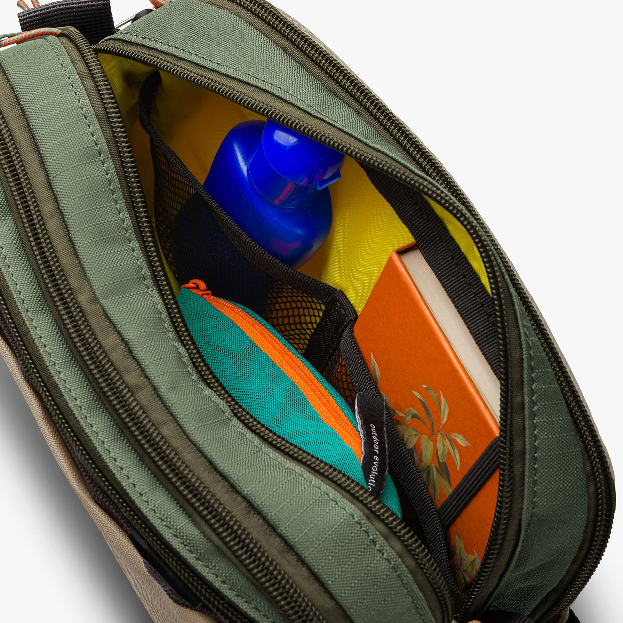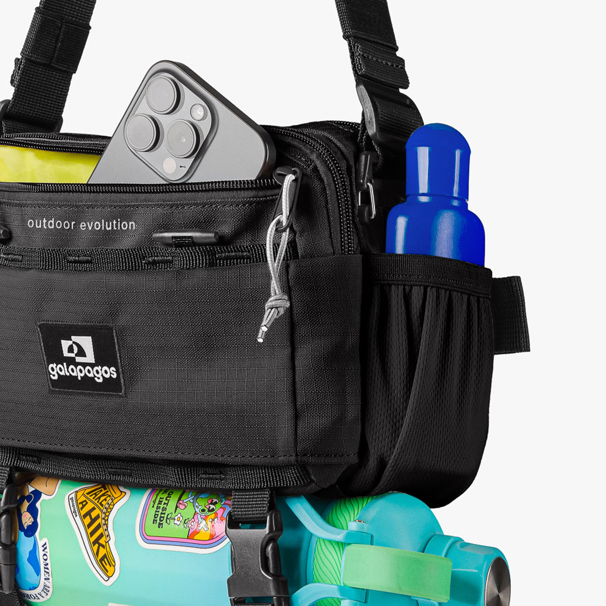 Com 3,6 litros de capacidade, espaço e organização não vão faltar. Possui três compartimentos principais, divisórias internas e bolsos em tela, tudo fica no lugar certo. As tiras costuradas do tipo daisy chains oferecem pontos extras para amarração e os tirantes na base ampliam a capacidade para uma garrafa ou para o que fizer sentido pra você.