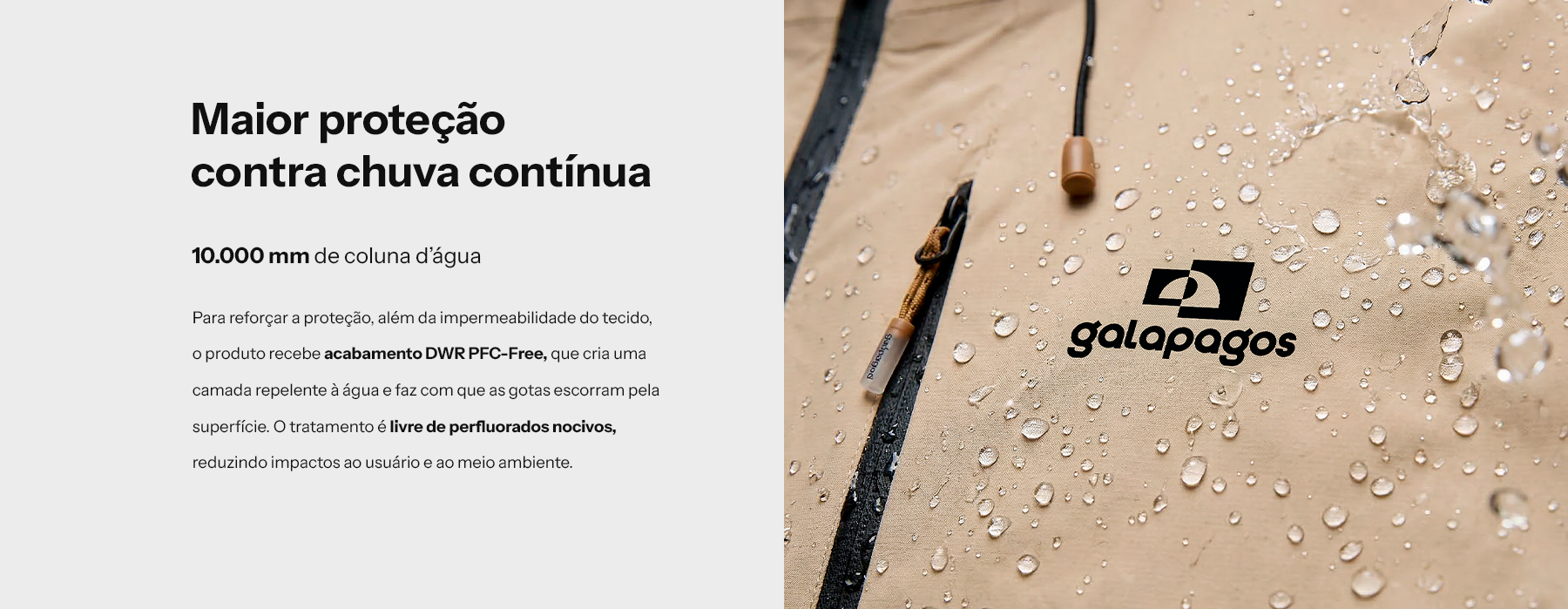 O tecido conta com acabamento DWR PFC-Free, que cria uma camada repelente à água e faz com que as gotas escorram pela superfície. Este tratamento é livre de perfluorados nocivos, oferecendo uma solução mais segura para você e para o meio ambiente.