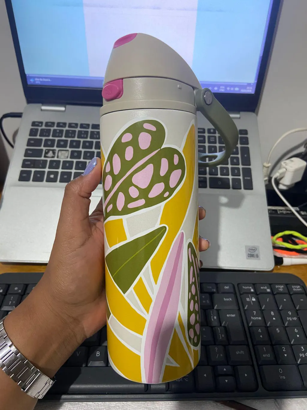 A Garrafa Duo Flow edição exclusiva é o resultado da collab entre Galapagos Outdoor e a artista e criadora de conteúdo Jhenny Keller, conhecida por seu estilo intuitivo e pela forma como traduz a natureza e o lifestyle em arte. Nesta parceria, Jhenny criou uma estampa única, aplicada em impressão 3D de alta definição, que transforma a Duo Flow em uma garrafa cheia de personalidade com acabamento premium.